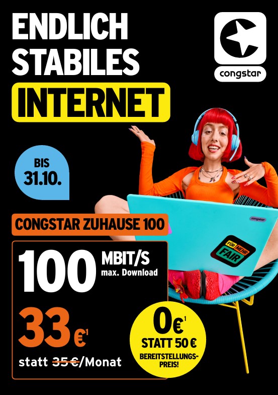 1) Neukundenaktion bis zum 31.10.2025. congstar Zuhause 100 kostet 33 statt 35 €/Monat. Mindestvertragslaufzeit: 24 Monate. Einmaliger Bereitstellungspreis: 0 € statt 50 €. Voraussetzung für die Nutzung des Tarifs ist ein geeignetes Endgerät (gegen Aufpreis erhältlich) congstar Zuhause 100 ermöglicht eine Datennutzung von max. 100 Mbit/s im Download und 40 Mbit/s im Upload. Ohne Festnetz-Telefonie. congstar Zuhause ist in vielen Anschlussbereichen verfügbar.