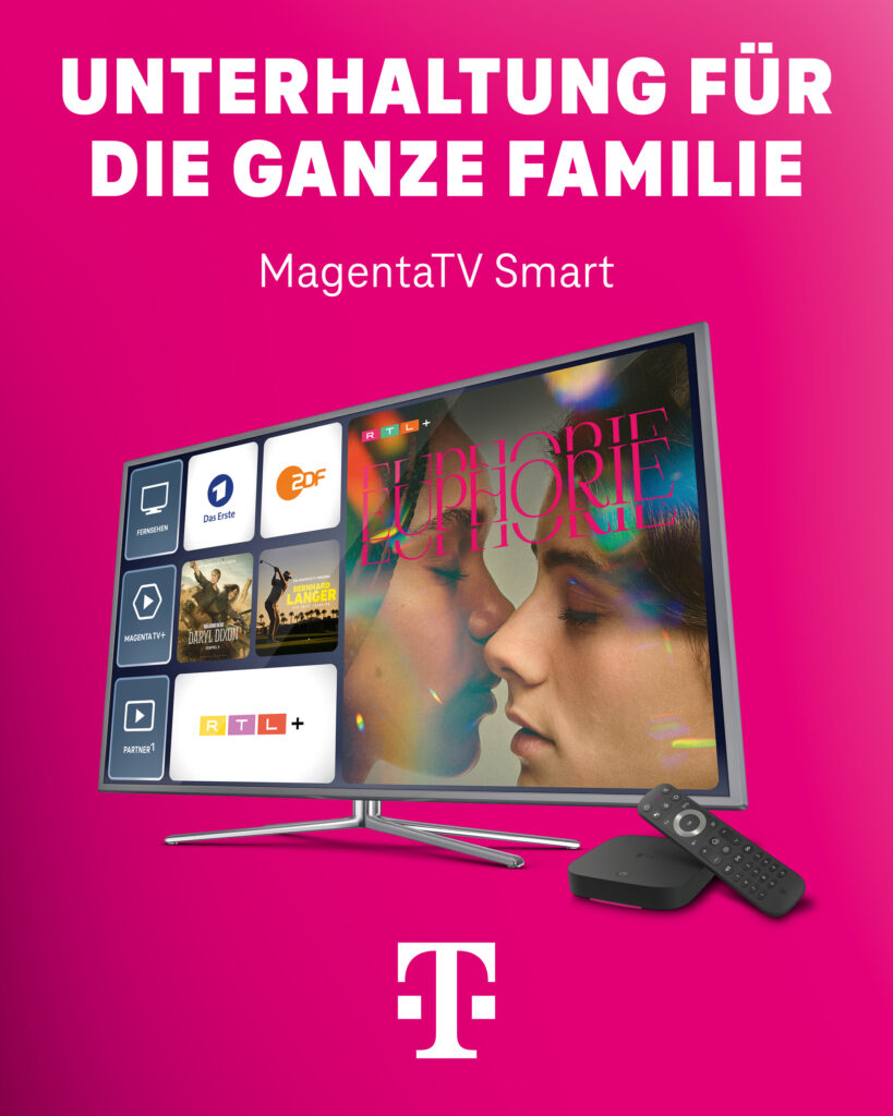 2) Aktion gilt bis 02.02.2026 für MagentaTV Neukunden. MagentaTV Smart kostet in den ersten 6 Monaten 0 €/Monat, danach 10 €/Monat. Mindestvertragslaufzeit 24 Monate. MagentaTV ist über die MagentaTV App ohne zusätzliche Hardware empfangbar. Auf Wunsch kann die TV-Box MagentaTV One für 5 €/Monat, zzgl. 6,95 € Versandkosten, mit einer Mindestvertragslaufzeit von 12 Monaten gemietet werden. Alle Preise inkl. der gesetzlichen MwSt. Voraussetzung für die Nutzung ist eine bestehende Internetverbindung. Für die Internetverbindung gelten die Bedingungen des jeweiligen Internetanbieters. Bei Nutzung über das Mobilfunk-Datennetz erfolgt die Belastung des Datenvolumens beim jeweiligen Mobilfunk-Anbieter.