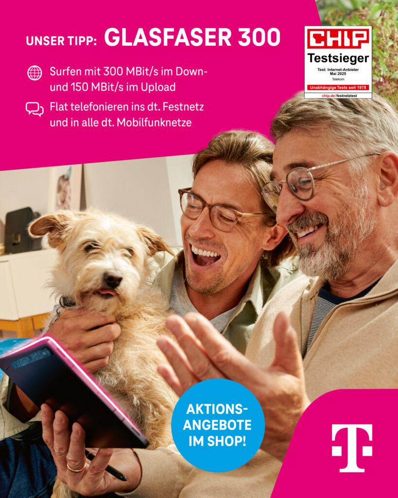 * Aktion gilt bis 02.02.2026 für Breitband-Neukunden, die in den letzten 3 Monaten keinen Breitbandanschluss bei der Telekom hatten. Glasfaser 300 kostet in den ersten 3 Monaten 19,95 €/Monat, danach 50,95 €/Monat. Bei Miete eines Routers im Endgeräte-Service-Paket (i. H. v. 7,95 €/Monat) erfolgt eine Router-Gutschrift i. H. v. 100 €. Hardware zzgl. 6,95 € Versandkosten. Der einmalige Bereitstellungspreis für einen neuen Telefonanschluss beträgt 69,95 €. Die Mindestvertragslaufzeit für Glasfaser 300 beträgt 24 Monate, für Hardware 12 Monate. Alle Preise inkl. der gesetzlichen MwSt. Für die Bereitstellung von Glasfaser 300 ist ein Glasfaser-Hausanschluss erforderlich. Sofern noch nicht vorhanden, wird dieser bei einer verbindlichen Buchung des Tarifs Glasfaser 300 neu verlegt, vorausgesetzt, die Anschlussadresse für den Tarif ist mit der Adresse des mit Glasfaser anzuschließenden Gebäudes identisch. Die Bereitstellung erfolgt, wenn Hauseigentümer/Hausverwaltung dem Ausbau zustimmen und die finale Prüfung den Ausbau bestätigt. Durch Eingabe einer Adresse auf der Internetseite telekom.de/glasfaser kann geprüft werden, ob diese in einem Glasfaser-Ausbaugebietder Deutschen Telekom liegt.