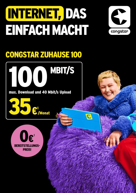 1) Neukundenaktion bis zum 31.03.2026: congstar Zuhause 100 kostet 35 €/Monat. Mindestvertragslaufzeit: 24 Monate. Einmaliger Bereitstellungspreis: 0 € statt 50 €. Congstar Zuhause ermöglicht eine Datennutzung von max. 100 Mbit/s im Download und 40 Mbit/s im Upload. Ohne Festnetz-Telefonie. Congstar Zuhause ist in vielen Anschlussbereichen verfügbar.